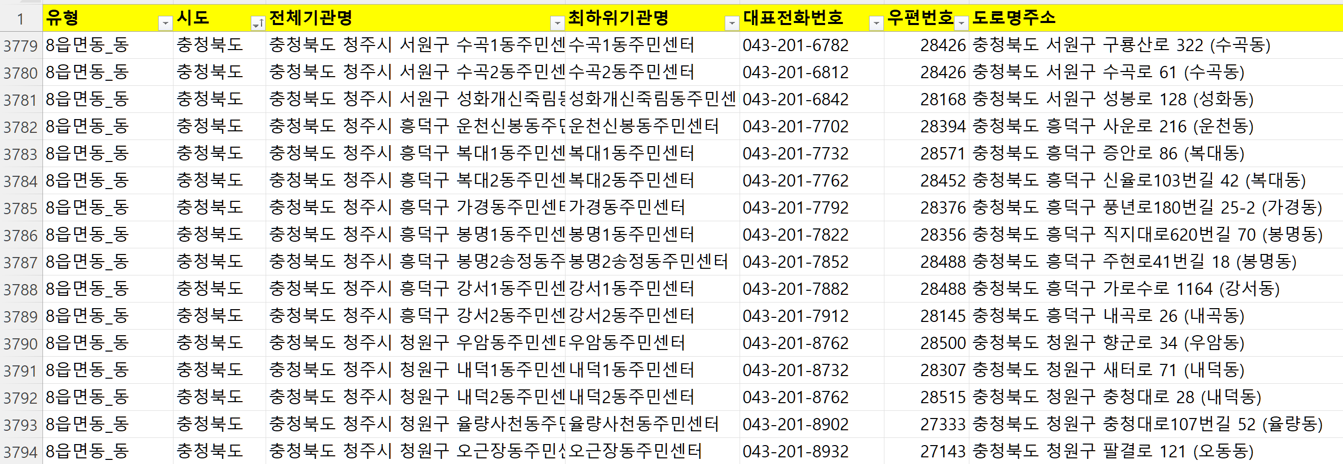 - 유형(시청, 도청, 군청, 구청, 면사무소, 읍사무소, 행정복지센터 등 구분)